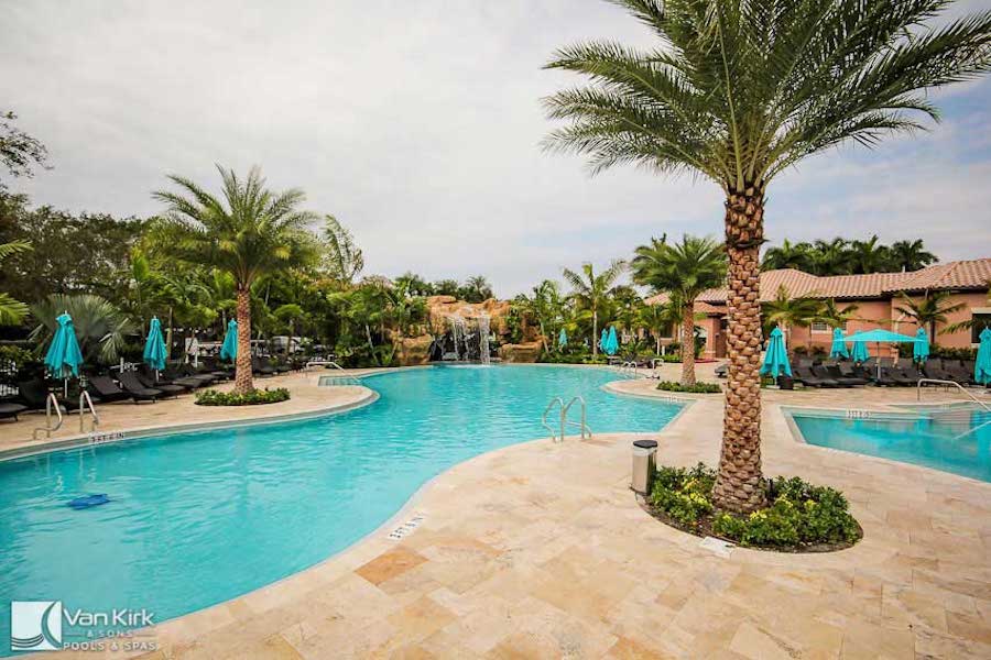 Palm-lined luxury pool area designed by Van Kirk & Sons Pools & Spas for Broken Sound Club.